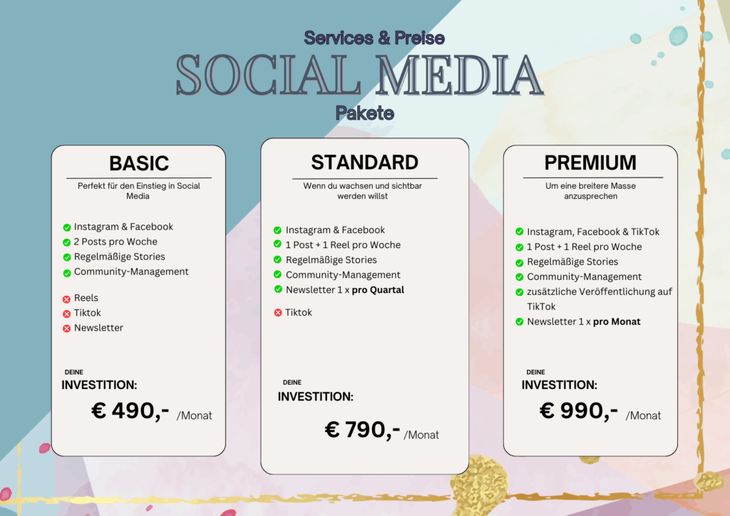 Die hier angeführten Pakete sind Richtwerte. Wenn du spezielle Wünsche hast, schnüren wir gerne ein maßgeschneidertes Angebot für dich.
